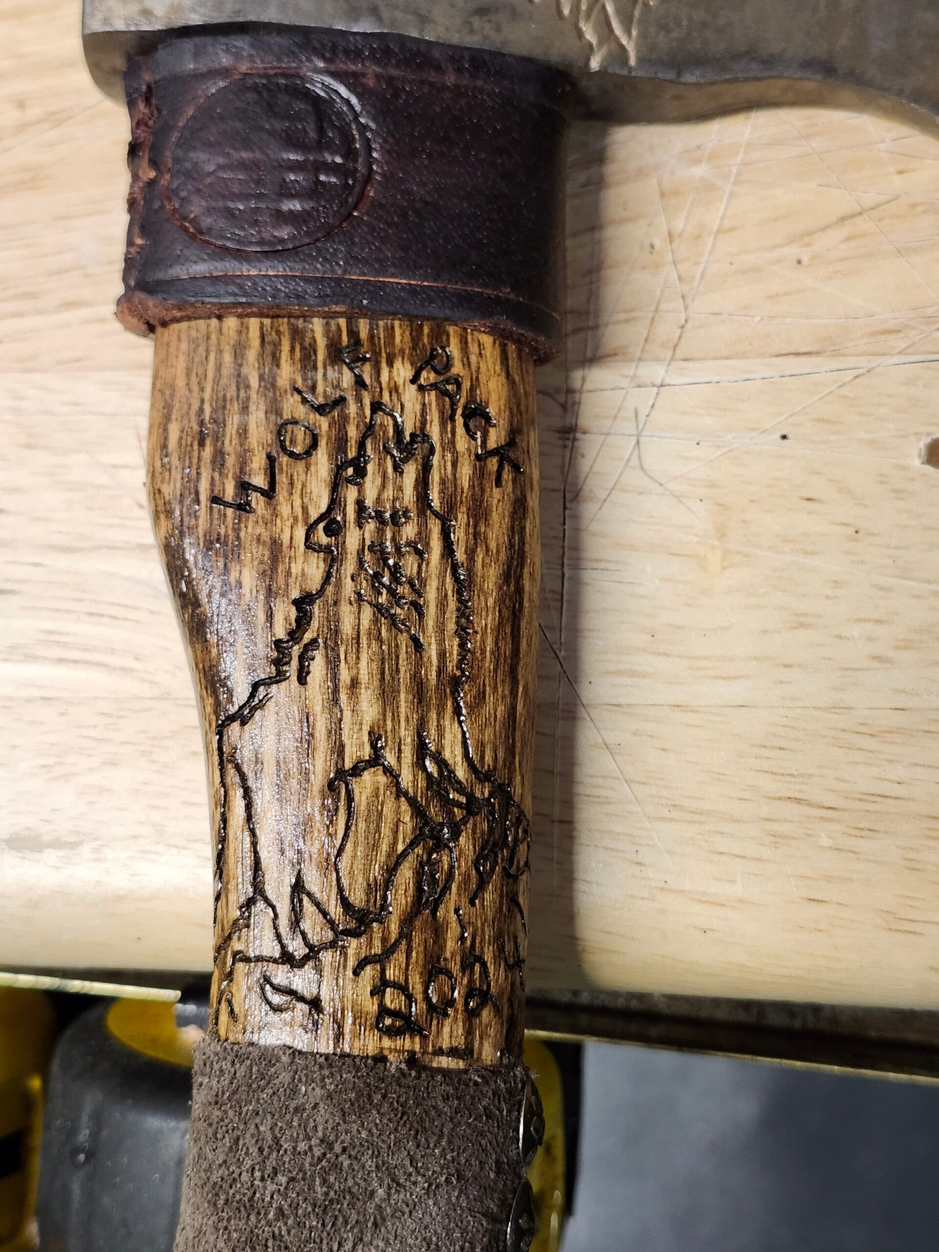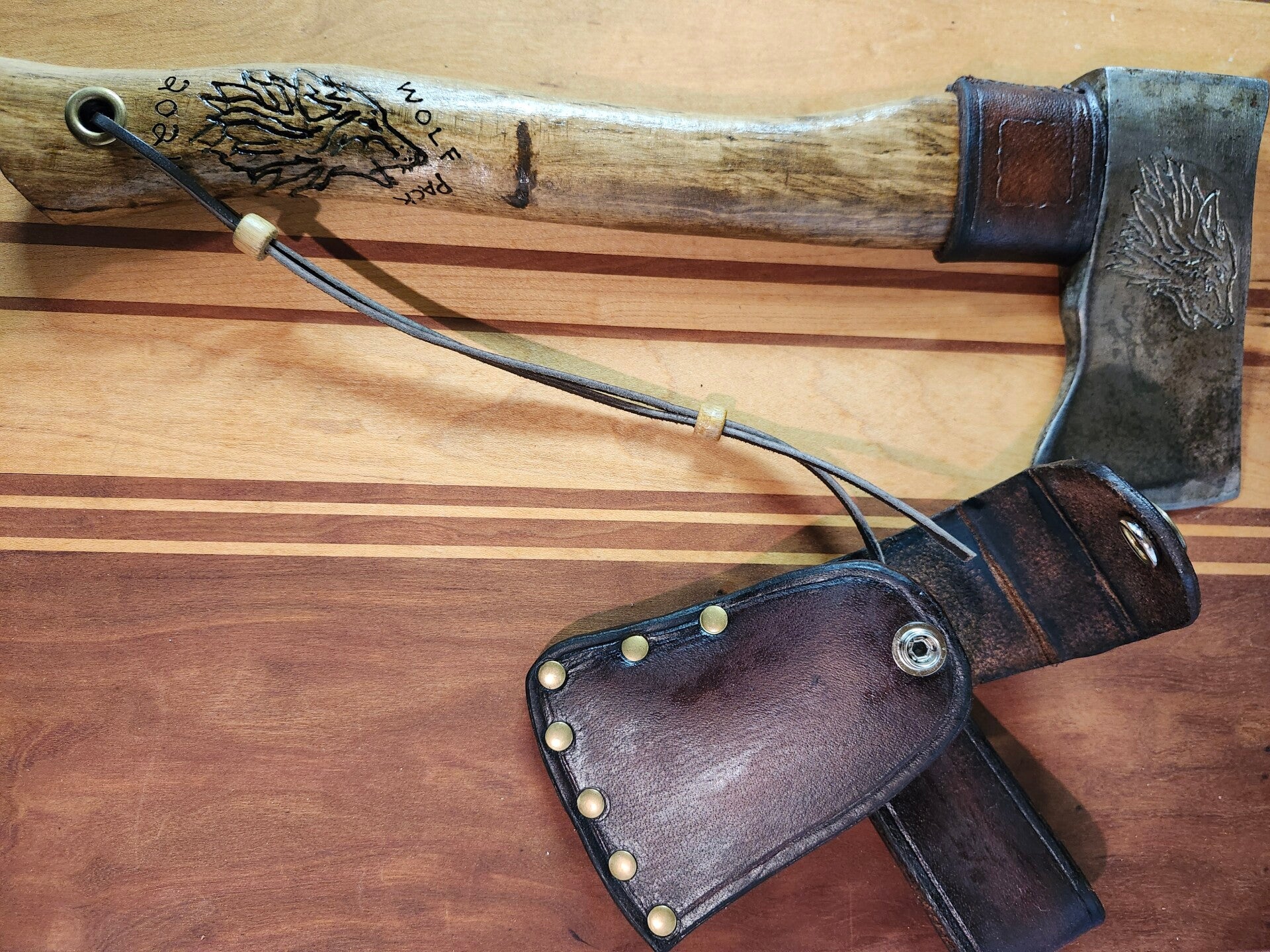 The lone Wolf series 1-1/4 lb. Camping backpacking utility hatchet made from high carbon steel handcrafted hard wood handle that is hand carved it comes with a handmade leather sheath , the hatchet is approximately 15 inches long and weighs approximately 1-1/4 lbs.
